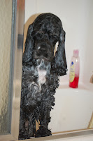 Hello to all of our friends !!!! Boy have we been busy, Mom has had her hands full with work & taking care of the 3 of us. We had a great day running & playing ball and then we came home and had a great dinner. After dinner Mom brushed all 3 of us out then we each got special time with Mom giving us a wonderful bath. We always feel great after our bathes.Mom says that we all look really cute even with wet hair !!!!! After we all get cleaned up we all start running around in the house chasing each other up & down the long hallway. Gracie that's me I like to do my cute little break dancing after I get done with my bath. Mom got the camera and took pictures of all of us getting our bathes & me break dancing too. We hope you enjoy looking at the pictures. Until next time we send lots of Cocker kisses to all of our friends !!!!!